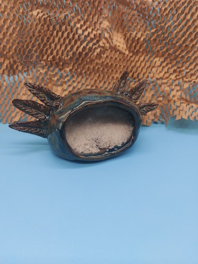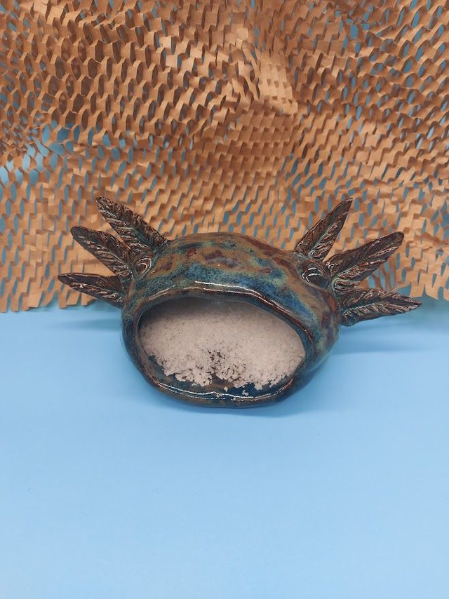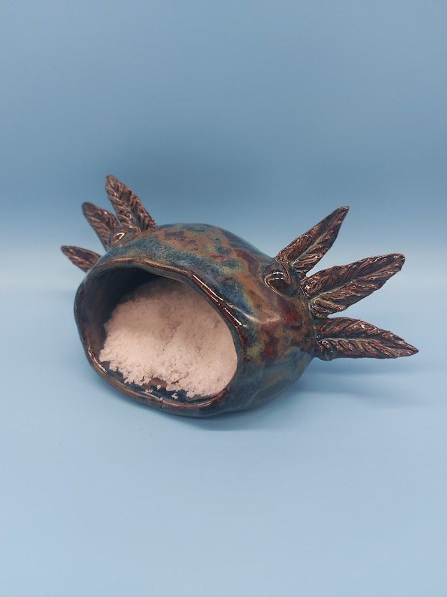 This ceramic axolotl is completely handmade and individual in appearance. This piece was coated with a reactive stoneware glaze. It measures approximately 17cm x 7cm.