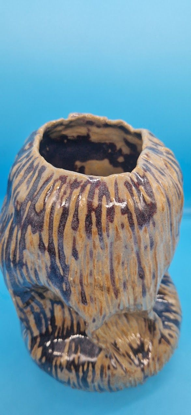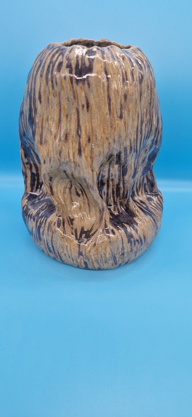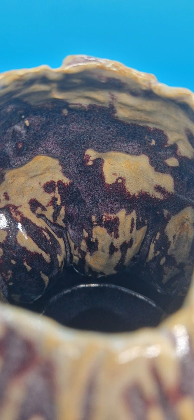 Featuring beautifully carved ridges and finished with a striking reactive glaze, the vase presents a unique blend of light brown and dark red hues, creating a rich, earthy contrast