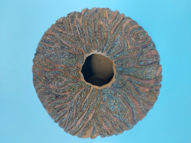 This piece was coated with a variety of reactive stoneware ceramic glazes, fluxes and oxides.