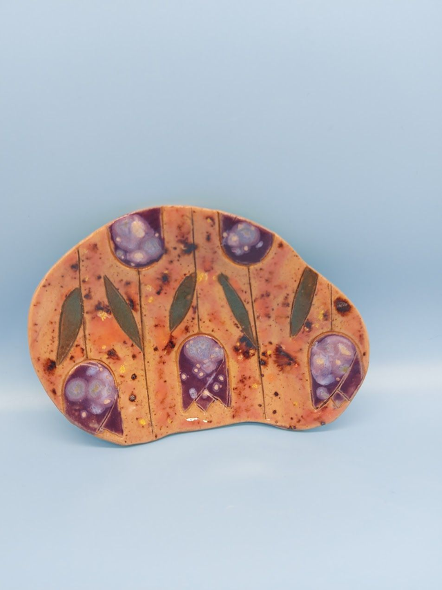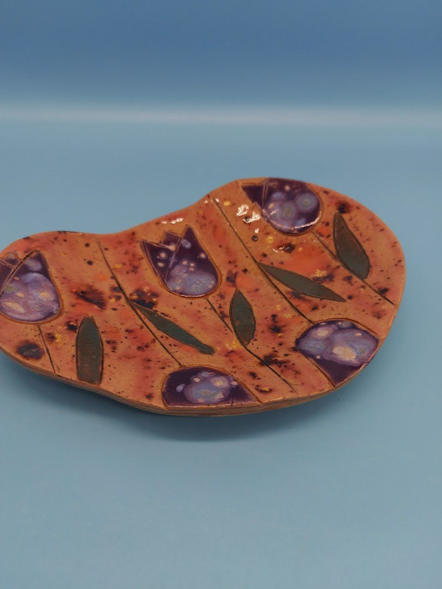 A handmade trinket dish with a tulip pattern engraved and decorated with three different glazes.